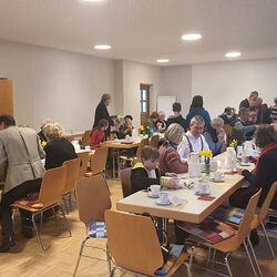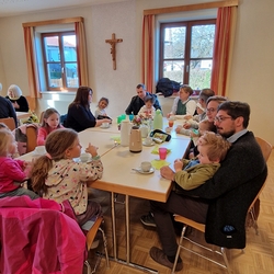 Im Anschluss an die schöne Feier waren alle zum „Pfarrcafe“ geladen, den der Kirchenchor mit viel Liebe vorbereitet hatte. Neben Kuchen und Kaffee genossen sichtlich alle das Zusammensitzen bei netten Gesprächen - und die Kinder das Spielen miteinander.