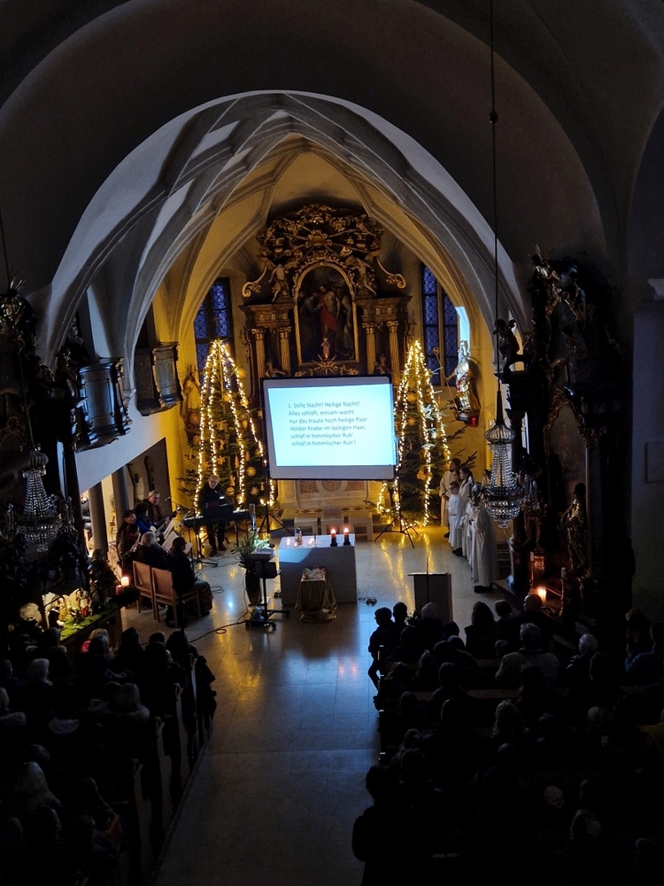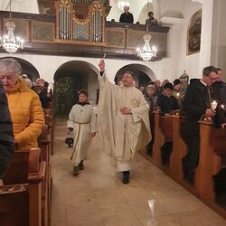 Vikar Norbert Glaser feierte mit vielen Gläubigen die Christmette und wurde von Diakon Michi Zepf unterstützt. Die Freude über die Geburt des Jesukindes, unseres Heilands, stand im Mittelpunkt und fand auch in den vielen schönen Weihnachtsliedern, die gemeinsam gesungen wurden, ihren Ausdruck. Die Friedensbotschaft der Heiligen Nacht möge Kreise ziehen und sich auf unserer Erde ausbreiten!