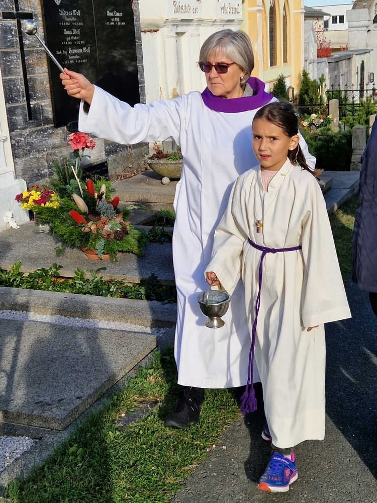 Bei strahlendem Sonnenschein fand am Allerheiligentag auf dem Friedhof die diesjährige Gräbersegnung statt, die Christa und Diakon Franz Habith sehr würdig und berührend gestalteten.