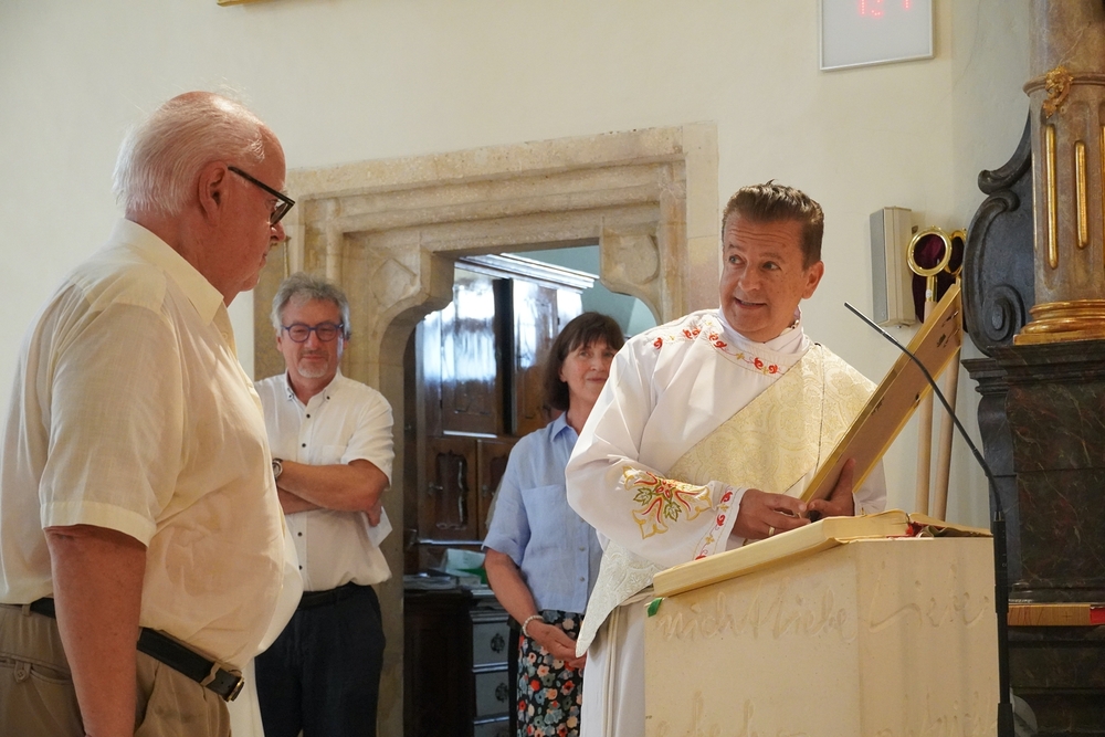 Das kleine Geburtstagsgeschenk der Pfarre und das Segenslied „Der Segen Gottes möge dich umarmen“, das von der ganzen versammelten Gottesdienstgemeinschaft dargeboten wurde, erfreuten Norbert sichtlich sehr. Er dankte für die nette Überraschung und die Gemeinschaft, in der er sich immer sehr wohl fühlt.