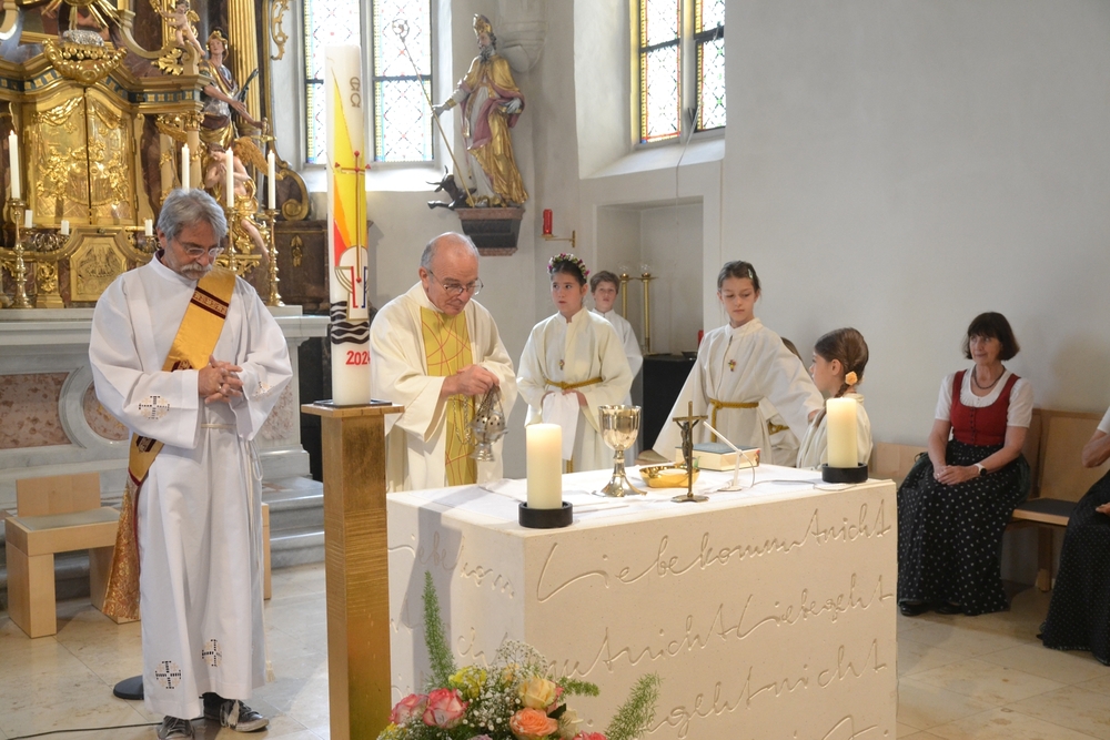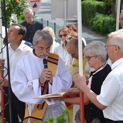 So konnte nach der heiligen Messe mit Vikar Norbert Glaser und Diakon Michi Zepf die Prozession wie geplant ihren Weg nehmen. An den vier Altären, die liebevoll geschmückt waren, wurde das Wort Gottes verkündet und Lobpreis, Dank und Bitte in Gebeten und Liedern ausgedrückt.