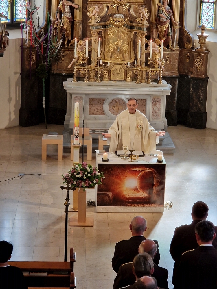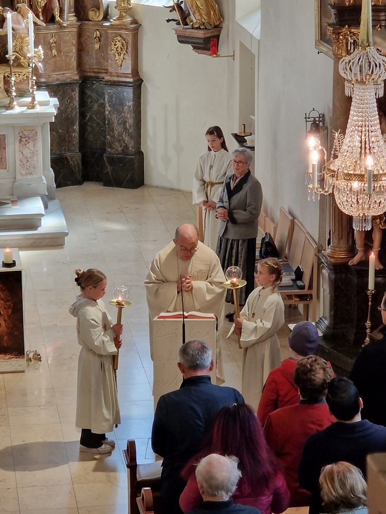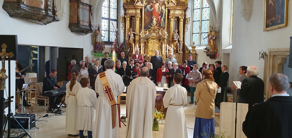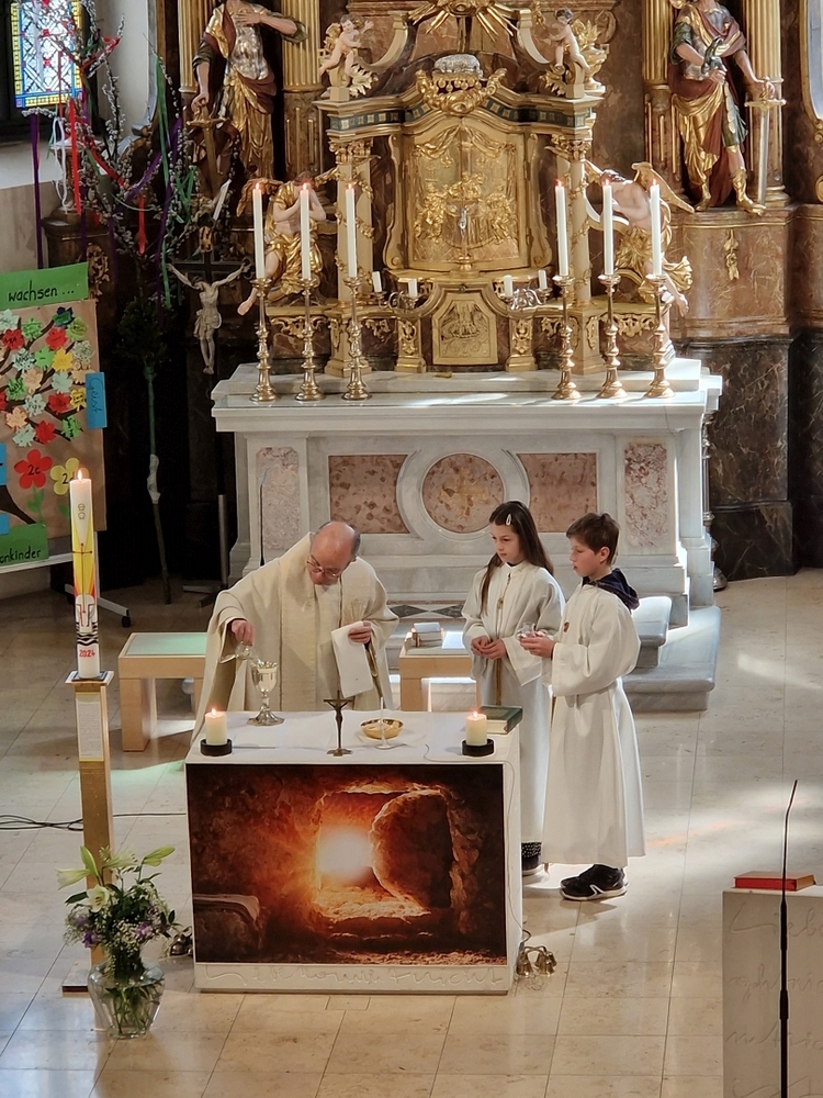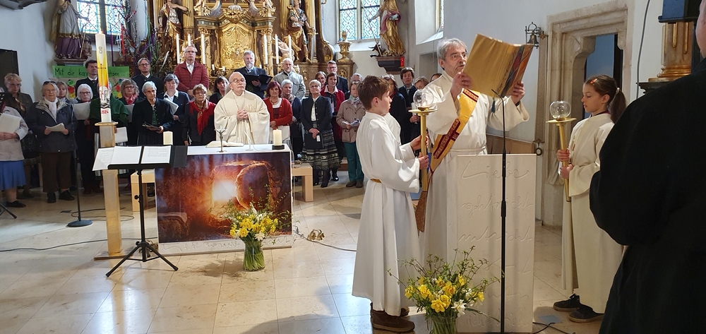 Die Auferstehungsfeier zelebrierten Vikar Gerhard Hatzmann und Diakon Michi Zepf, zusammen mit den Minis, den Lektorinnen und Lektoren, mit Kantor und Kantorin, der Musikgruppe und allen Gläubigen.