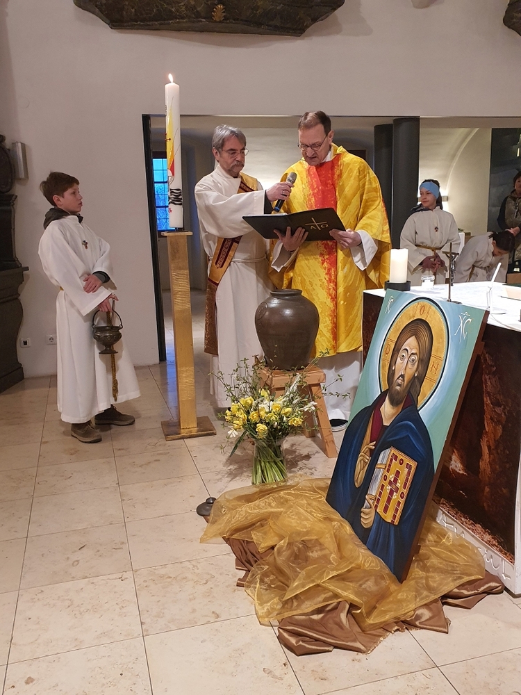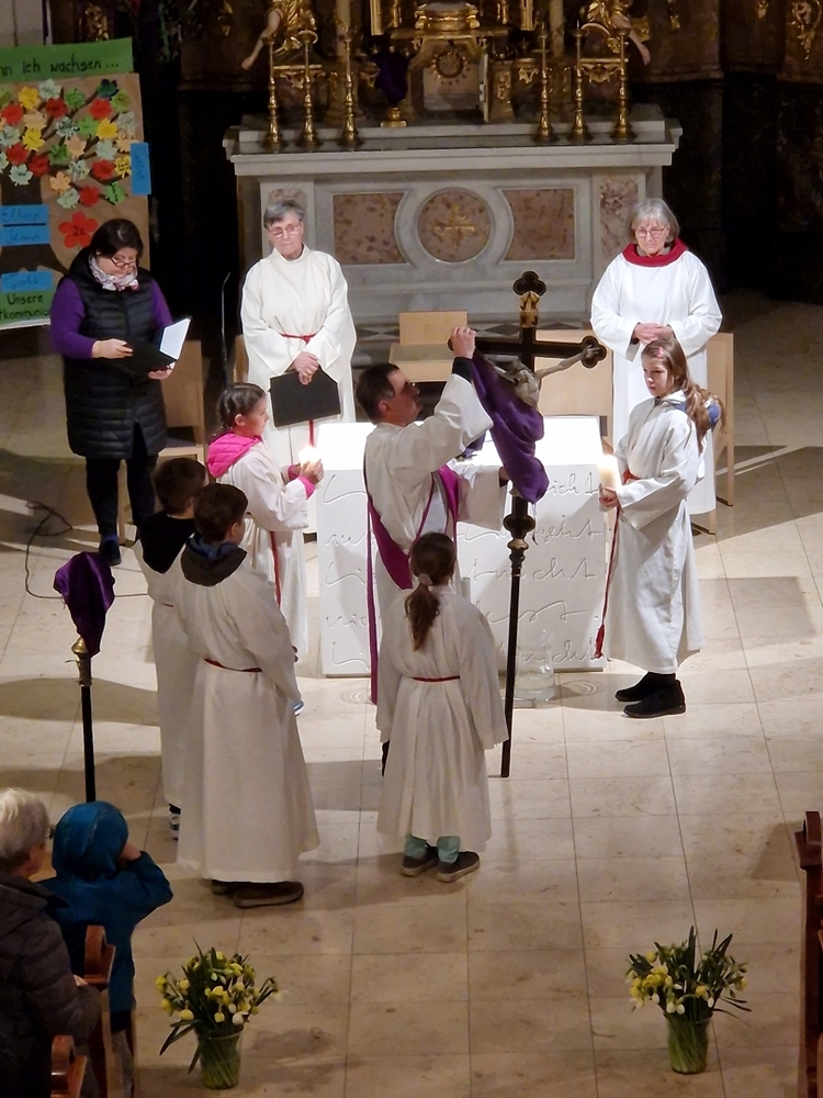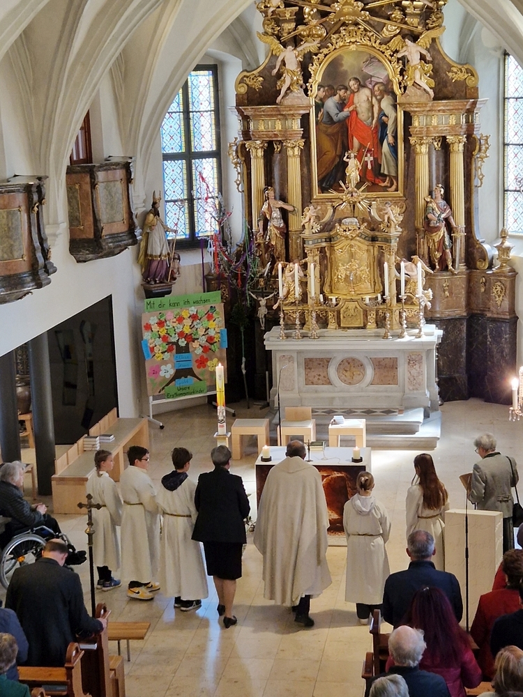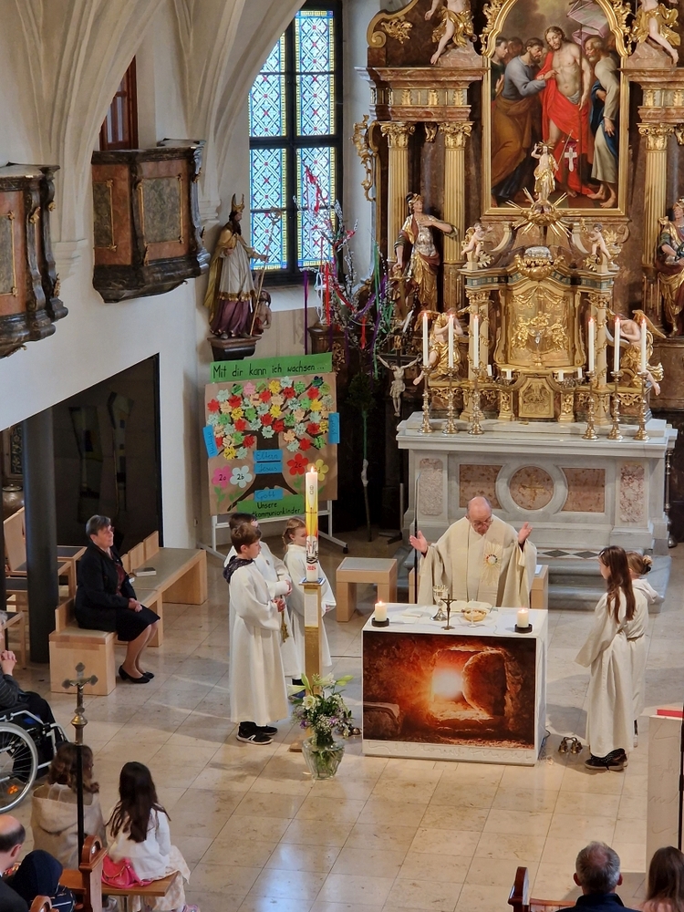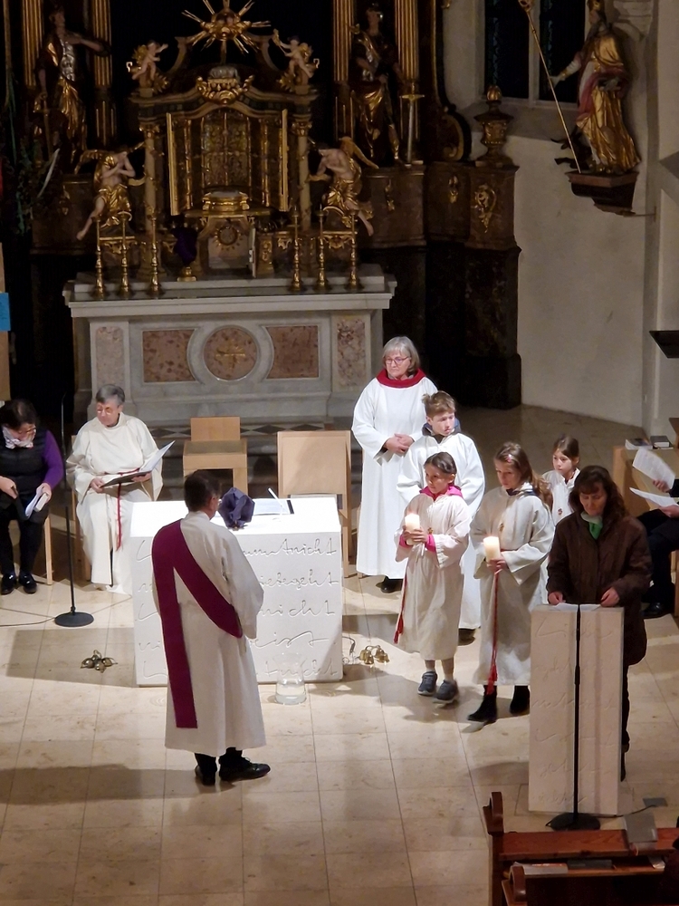 Die Auferstehungsfeier zelebrierten Vikar Gerhard Hatzmann und Diakon Michi Zepf, zusammen mit den Minis, den Lektorinnen und Lektoren, mit Kantor und Kantorin, der Musikgruppe und allen Gläubigen.