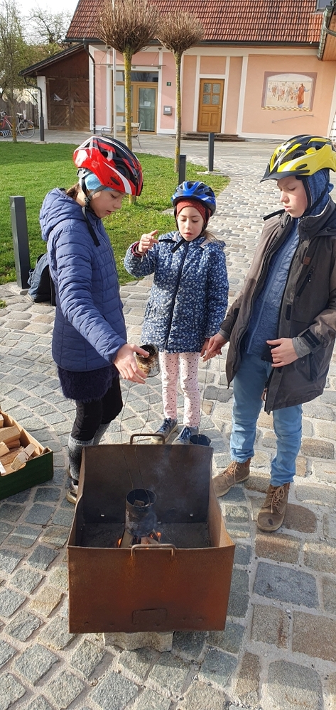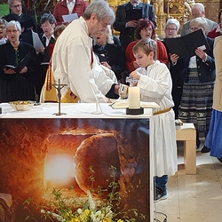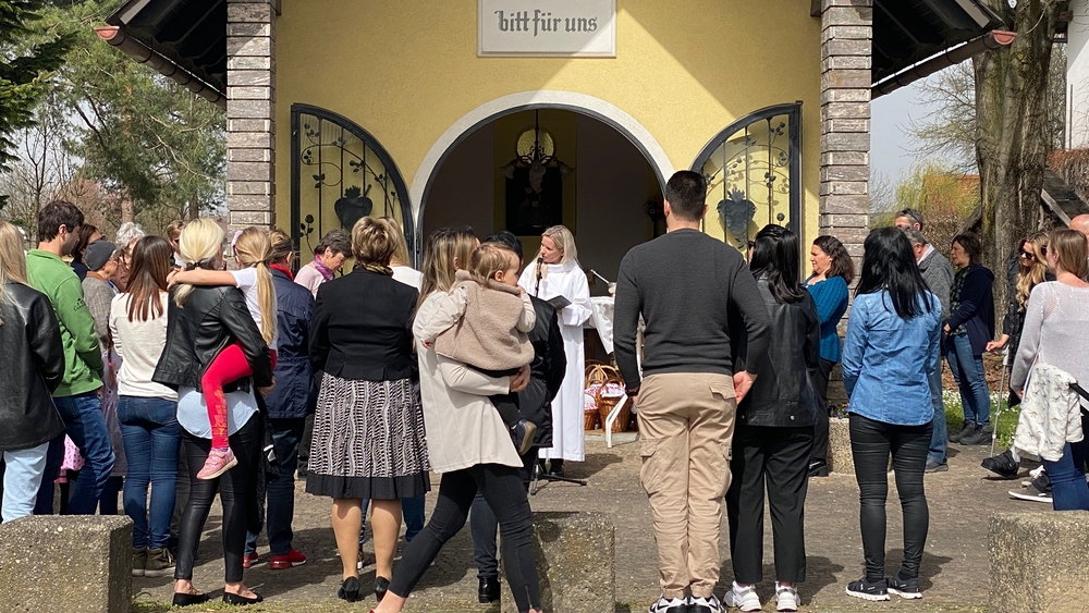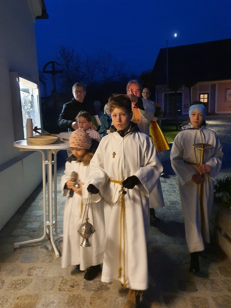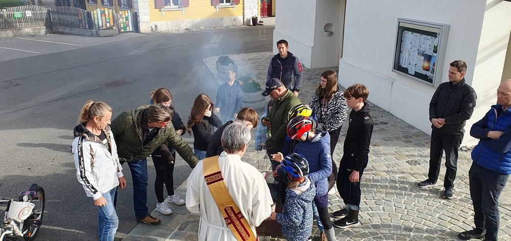 Nach altem Brauch segnete Diakon Michi Zepf am Karsamstag schon frühmorgens das Feuer vor der Kirche, das einige Kinder dann als „Weihfeuer“ in die Häuser und Wohnungen brachten. Es soll die Bewohner*innen vor Unwetter schützen.