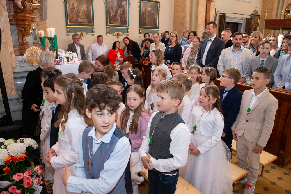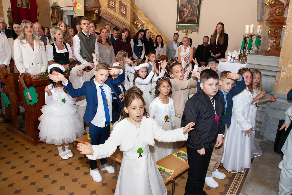 Die Kinder der vier 2. Klassen feierten am Samstag, 4. Mai ihre heilige Erstkommunion aufgrund der schlechten Wetterprognosen in der Pfarrkirche Wundschuh. Erstmals konnten wir mit 52 Kindern und ihren Familien nicht auf unserem Kirchplatz in Premstätten feiern. Bei 13 Grad Celsius zogen die Kinder in die Kirche ein. Doch uns wurde bald wärmer! Nicht nur durch das schöne miteinander Feiern, sondern auch weil so viele Gäste die Kirche bis auf den letzten Platz füllten.