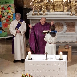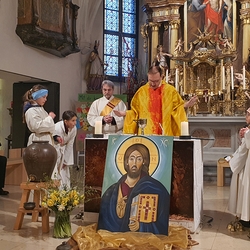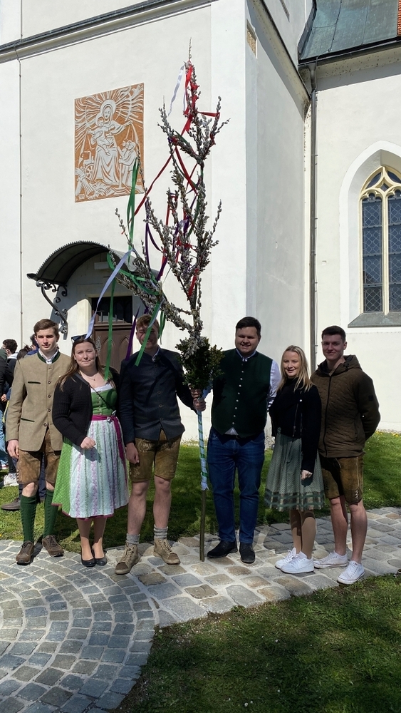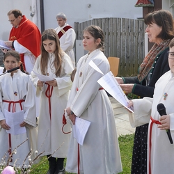 So feierten Groß und Klein mit Vikar Gerhard Hatzmann und Diakon Michi Zepf die heilige Messe zum Palmsonntag in einem schönen Miteinander. Die Kindergartenkinder sowie einige MS-Schülerinnen gestalteten die Feier mit und die MINIS versahen nicht nur ihren Dienst am Altar, sondern trugen auch die „Passion“ vor - in einer einfacheren Fassung, mit passenden Liedstrophen und Symbolen. Auch die Landjugend nahm teil und kam nach guter Tradition mit ihrem großen Palmbuschen.