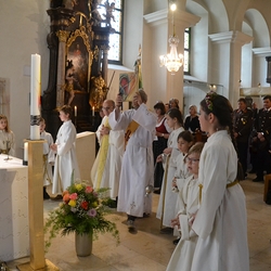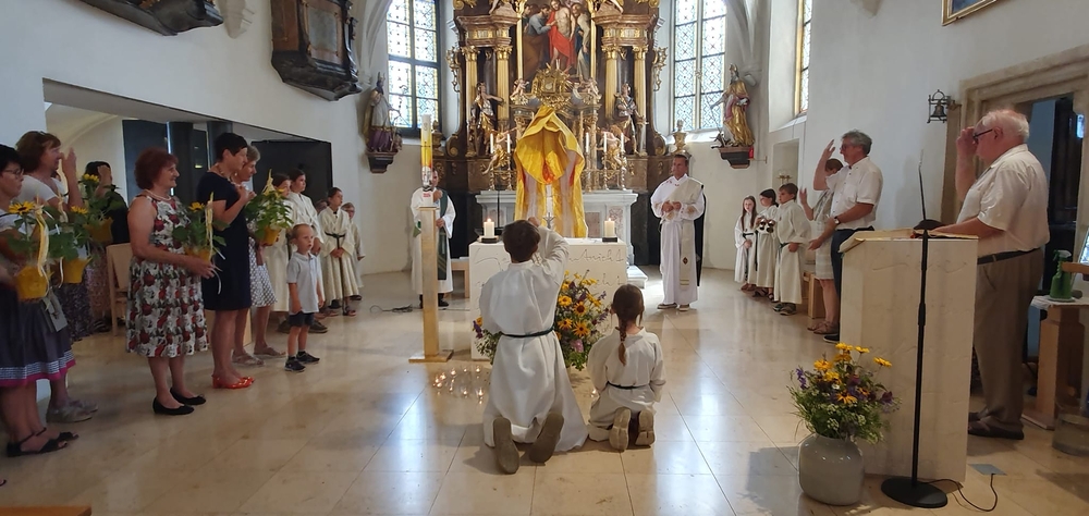 Die Erstkommunionkinder durften gemeinsam mit ihren Taufpaten/Taufpatinnen feierlich in die Kirche einziehen. Die Symbole der heiligen Taufe wurden vorgestellt und anschließend konnten die Patinnen/Paten und die Kinder ihr Taufversprechen sowie das Glaubensbekenntnis erneuern.