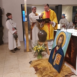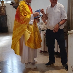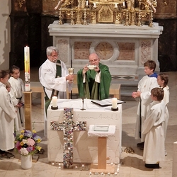 Nach altem Ritus segnete Diakon Michi Zepf nach dem Schlusssegen noch das „Dreikönigswasser“ und das Salz, welches in kleinen Fläschchen mitgenommen werden durfte. Die Allerheiligen-Litanei wurde von Johannes Chum vorgetragen.
