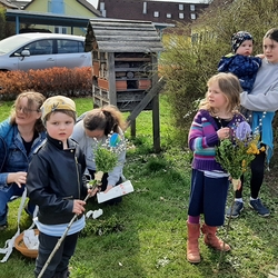 Mit großer Freude und Kreativität legten auch heuer die Minis am Vorabend zu Fronleichnam ein Blumenbild, diesmal sogar ein Tryptichon: Kelch und Brot, ein Kreuz und eine Taube wurden mit viel Eifer zuerst aufgemalt und dann mit den Blüten gestaltet.