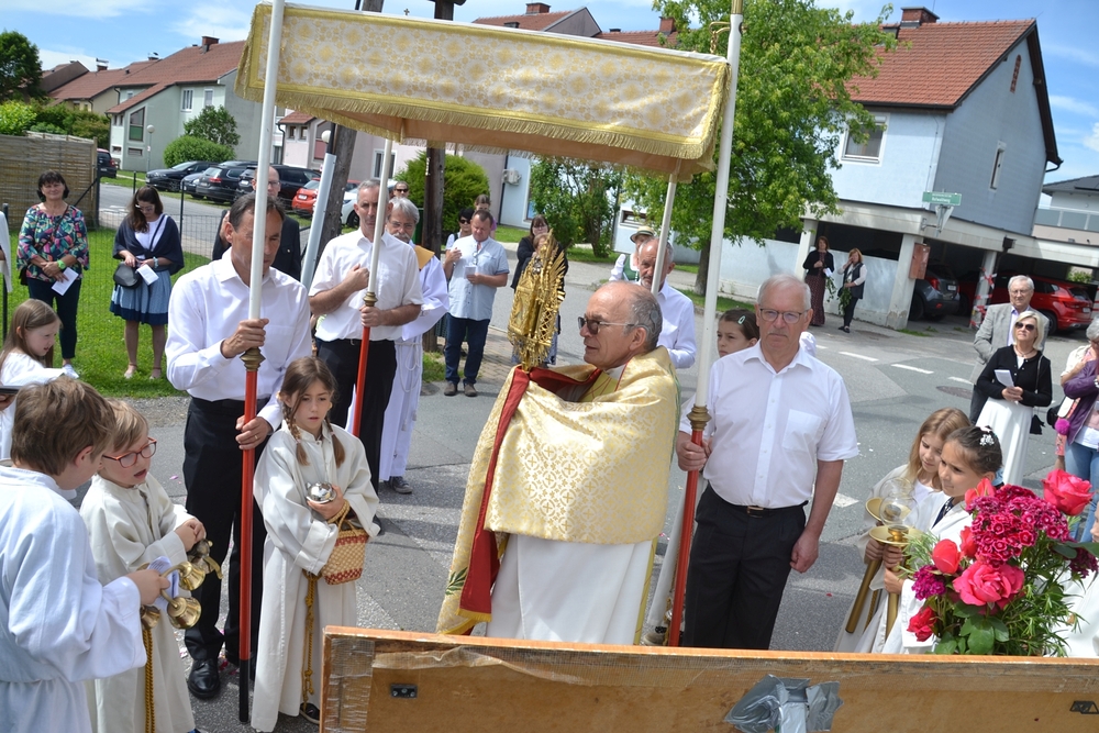 Mit Rosenkranzgebet und den Klängen der MUZ erreichte die Prozession schließlich den Kirchplatz, wo sich beim Altar vor dem Kreuz ein wunderschöner Blumenteppich befand, den die Minis am Vorabend mit großem Eifer gestaltet hatten. Diese „Augenweide“ wurde von vielen bewundert, auch von den mitfeiernden Gästen aus Wundschuh.