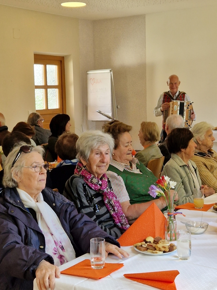 In netter Gemeinschaft genossen die Seniorinnen und Senioren dann die Würstel-Jause sowie Kuchen und Kaffee. Dazu sorgte Anton Ruprecht auf der Ziehharmonika für angenehme musikalische Untermalung.