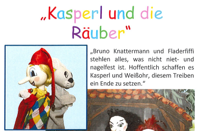 Kasperl und die Räuber Kasperl und die Räuber am 09. September um 15.30 Uhr im Pfarrgarten St. Veit am Vogau. Bei Schlechtwetter im Kultursaal St. Veit am Vogau. mehr: Kasperl und die Räuber