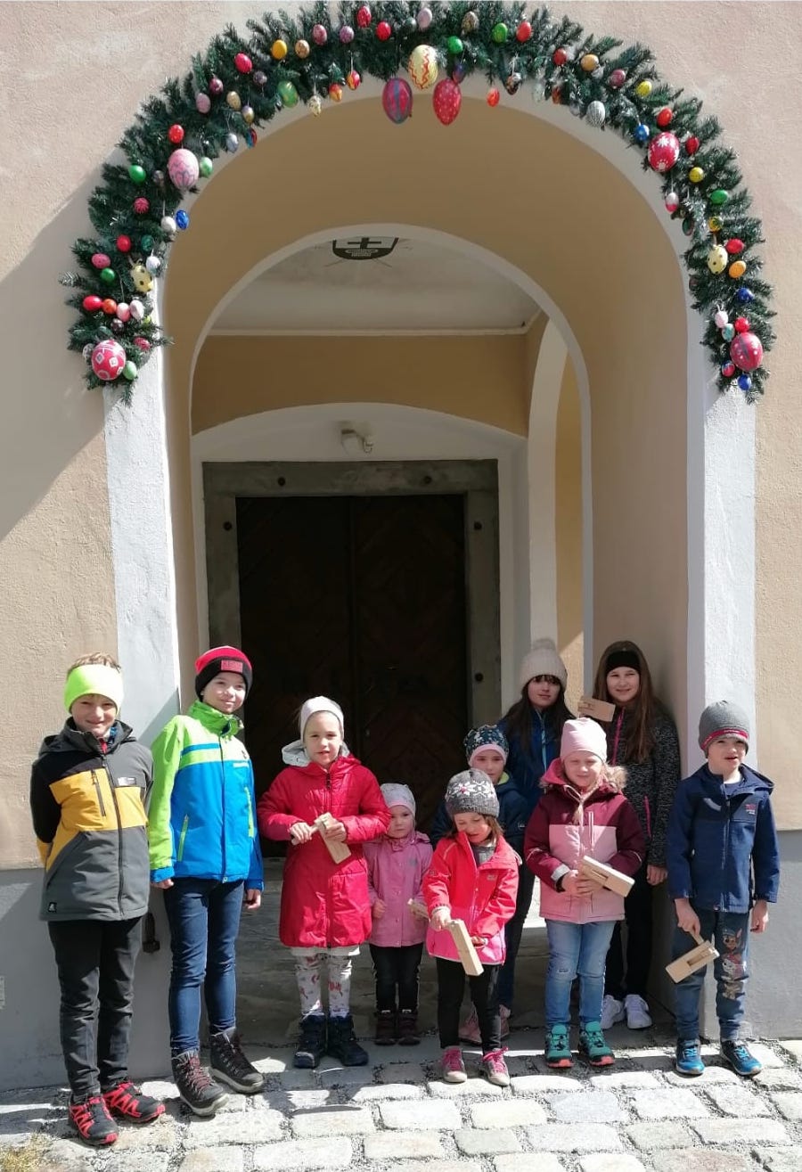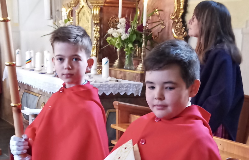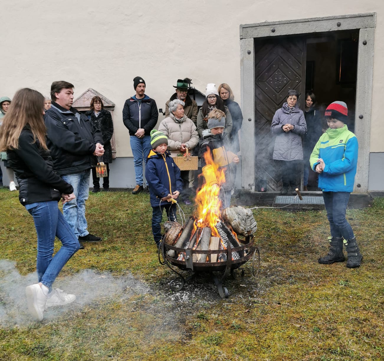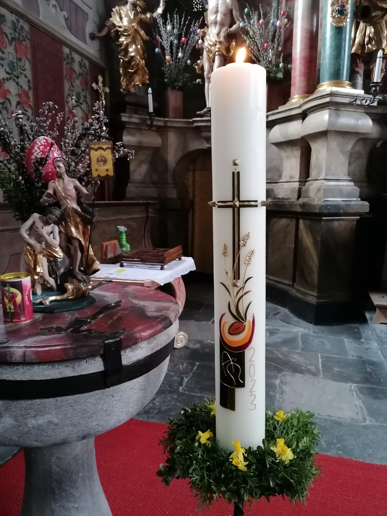 Auch das Osterfest wurde wieder „wie früher“ gefeiert: mit Ratschen, Weihschwamm- und Speisensegnung, Osternachtsfeier und der wieder sehr kunstvoll von Frau Helga Missethon gestalteten Osterkerze.